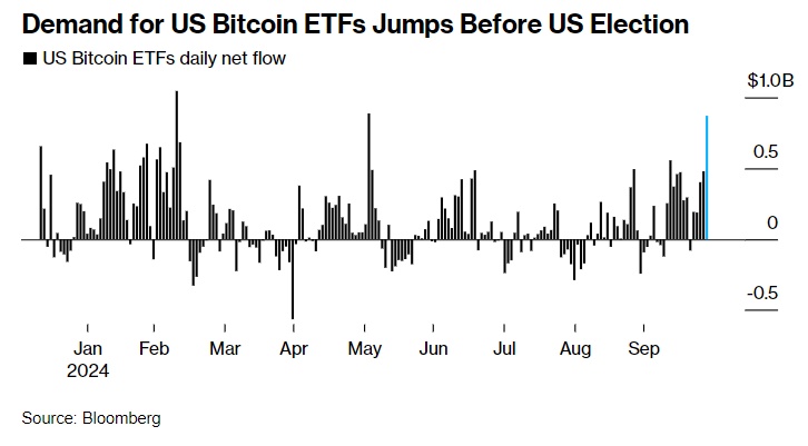 智通财经APP获悉,美国市场的比特币现货交易所交易基金(即比特币ETF)在周二获得高达8.7亿美元的净流入规模,为比特币ETF自从在美成功推出以来的历史第三高单日净流入。在全球资金大规模涌入的强势推动下,这一全球最大市值的加密货币在有关美国总统大选潜在结果的猜测中有望创下历史新高。目前比特币价格已超过7.3万美元,距离今年3月所创下的历史新高仅一步之遥。
