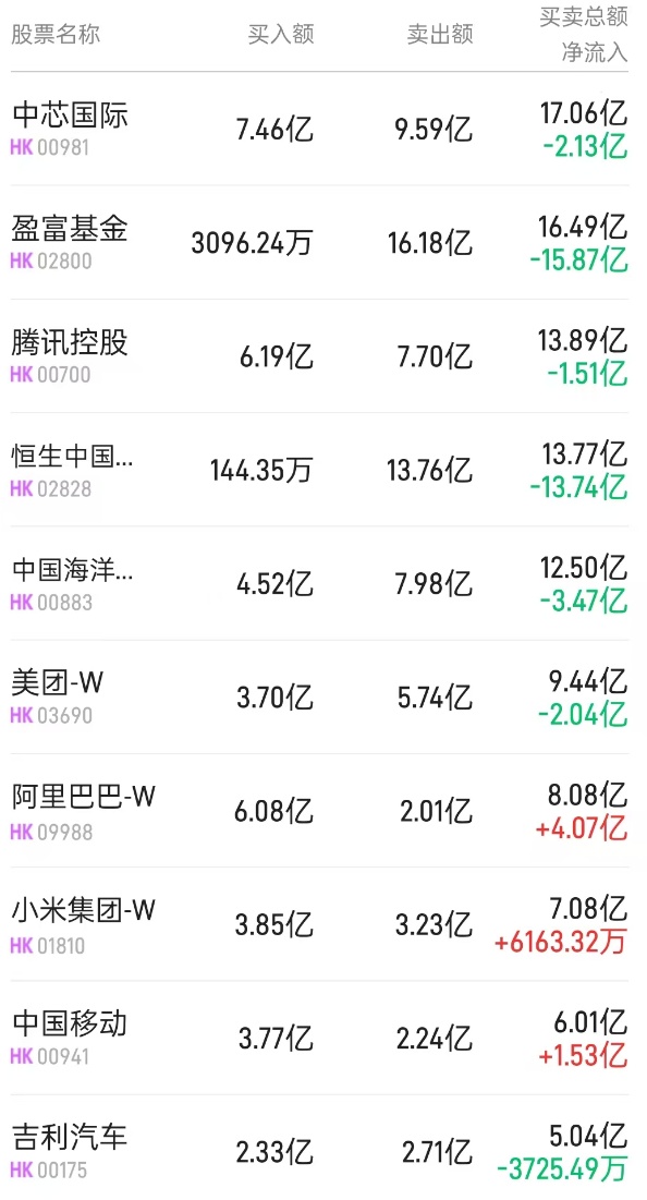 北水净买入最多的个股是阿里巴巴-W(09988)、小米集团-W(01810)、中国移动(00981)。北水净卖出最多的个股是盈富基金(02800)、恒生中国企业(02828)、南方恒生科技(03033)。