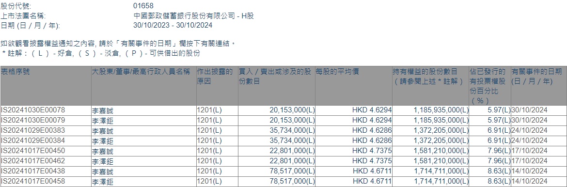 值得注意的是,此前李嘉诚及李泽钜于10月14日、10月17日、10月24日分别减持邮储银行7851.7万股、2280.1万股、3573.4万股。据计算,李嘉诚及李泽钜在本月内4次减持邮储银行已累计超1.57亿股,涉及资金超7.33亿港元。