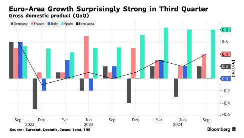 最大的担忧仍集中在德国,其制造业正在努力应对竞争力的丧失,高管们将其归咎于高能源成本、过度监管和熟练员工的短缺。这种不确定性导致消费者在近期薪资增长的情况下增加储蓄、减少消费。然而,随着该国统计局强调家庭和政府消费的增加是第三季度经济增长的原因,这种情况可能正在开始发生变化。