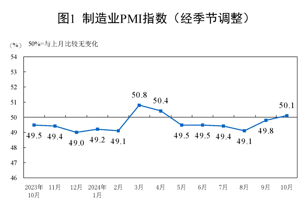 10月份,制造业采购经理指数(PMI)为50.1%,比上月上升0.3个百分点,制造业景气水平回升。