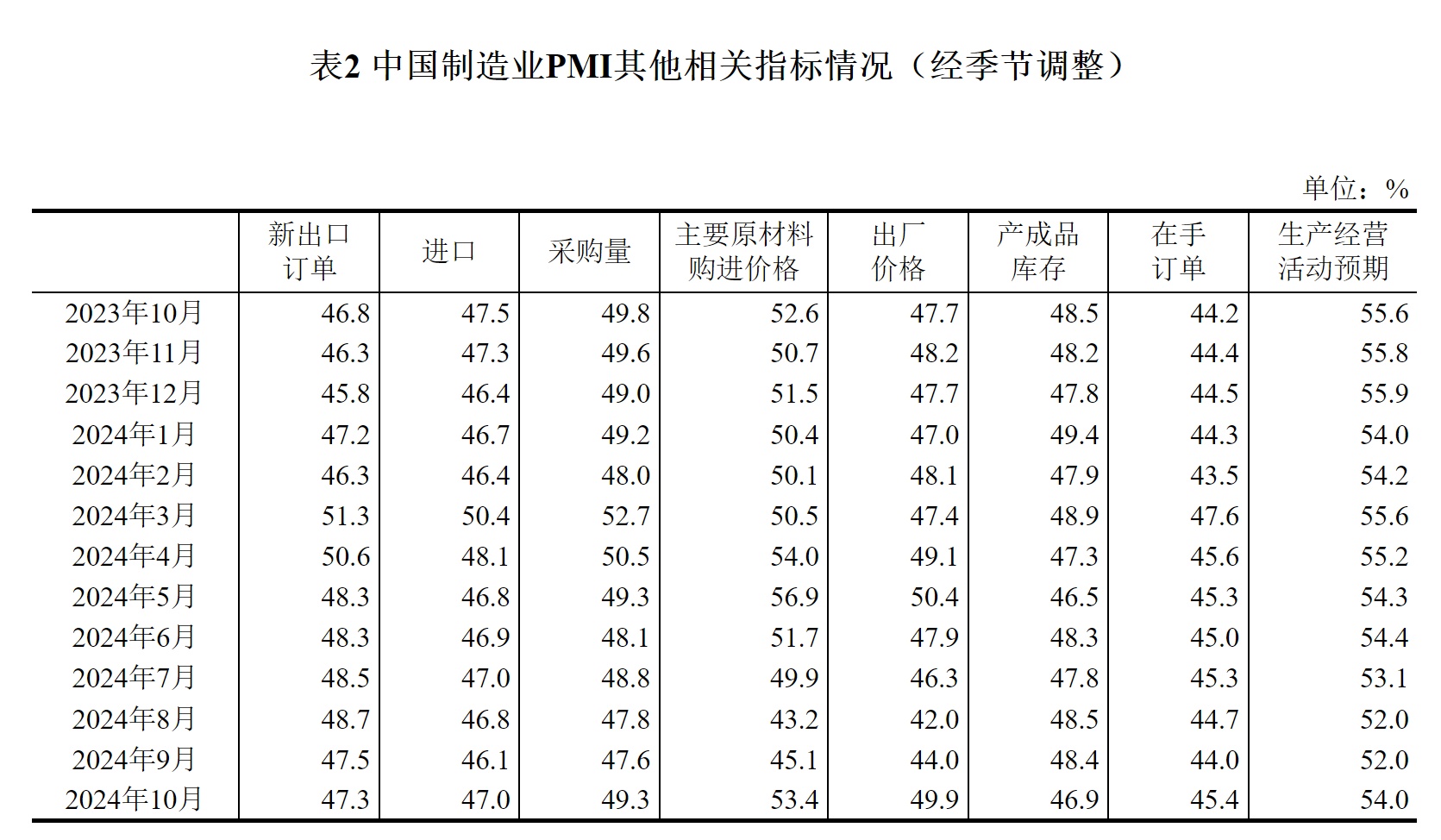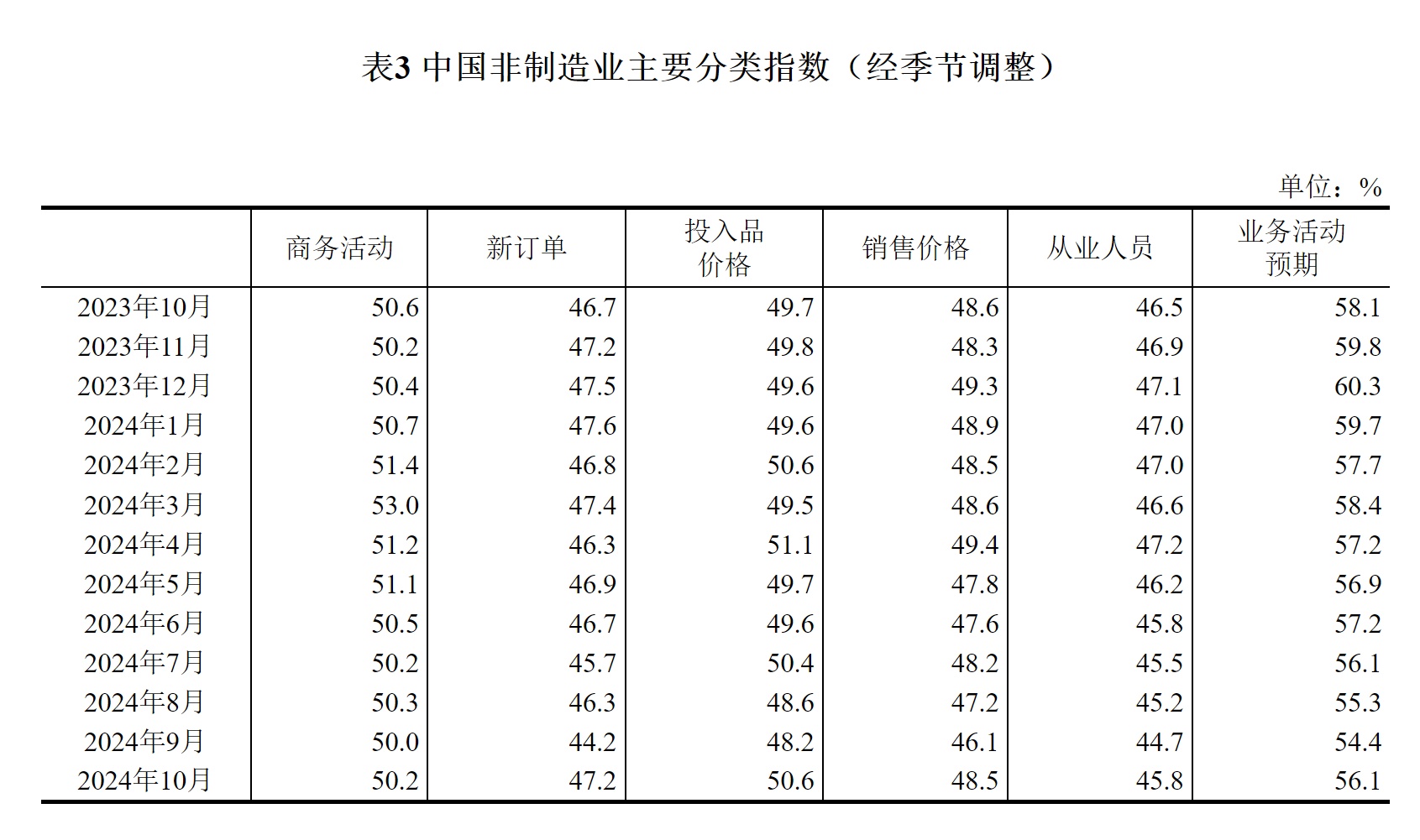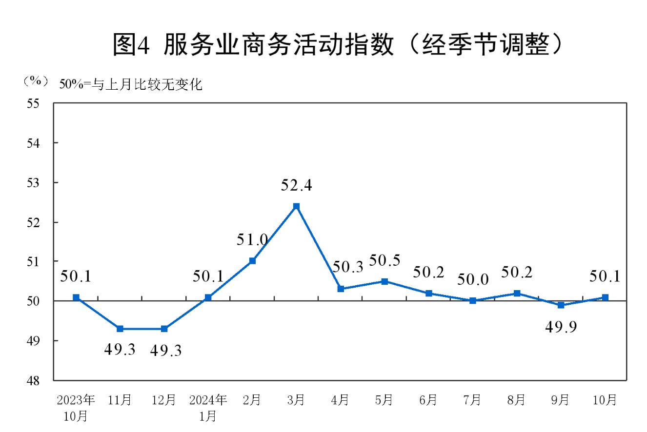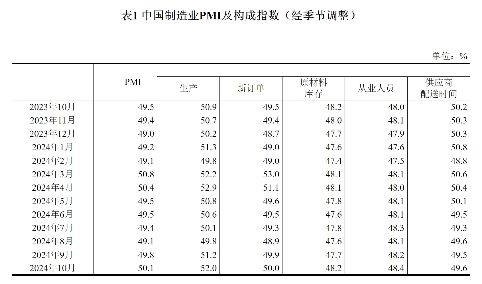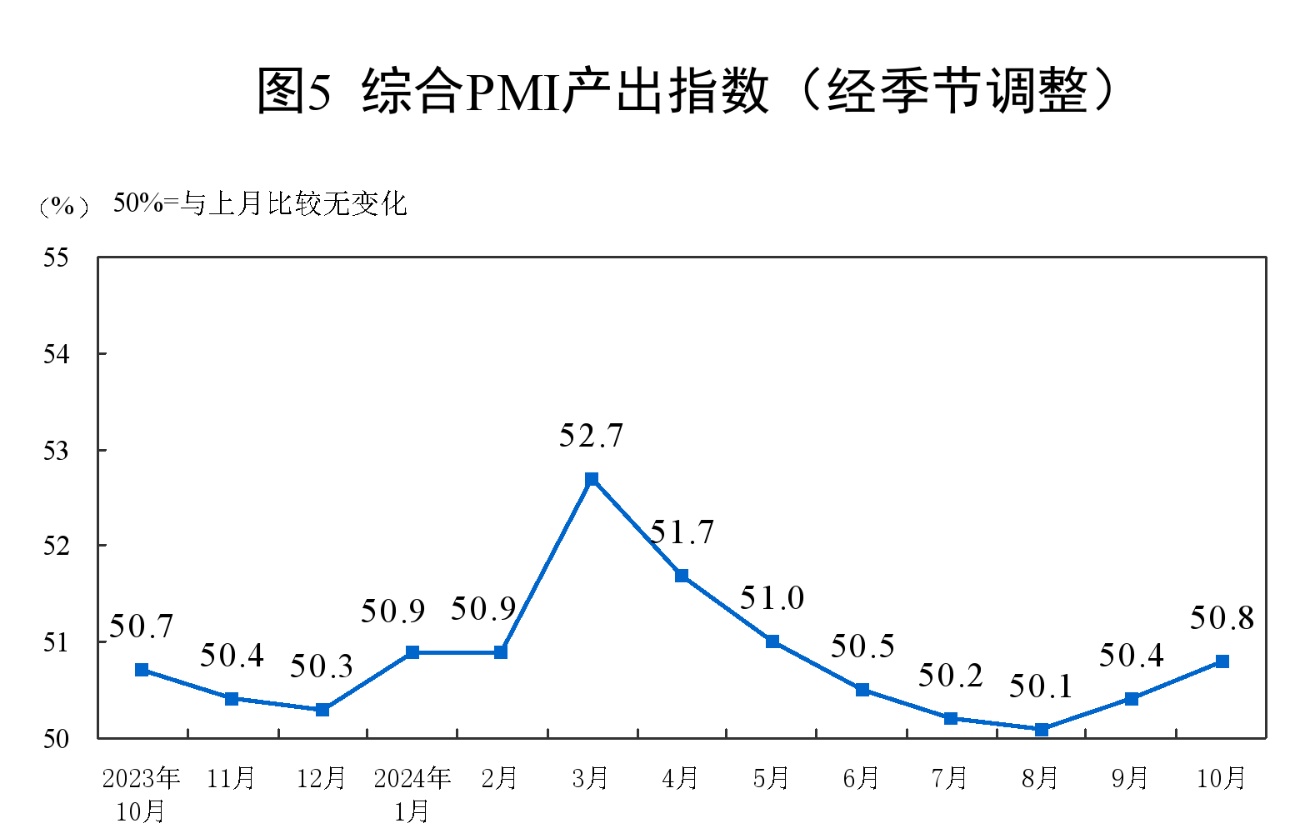 智通财经APP获悉,10月31日国家统计局发布2024年10月中国采购经理指数运行情况。10月份,制造业采购经理指数(PMI)为50.1%,比上月上升0.3个百分点,制造业景气水平回升。10月份,非制造业商务活动指数为50.2%,比上月上升0.2个百分点,非制造业景气水平小幅回升。10月份,综合PMI产出指数为50.8%,比上月上升0.4个百分点,表明我国企业生产经营活动总体扩张步伐有所加快。