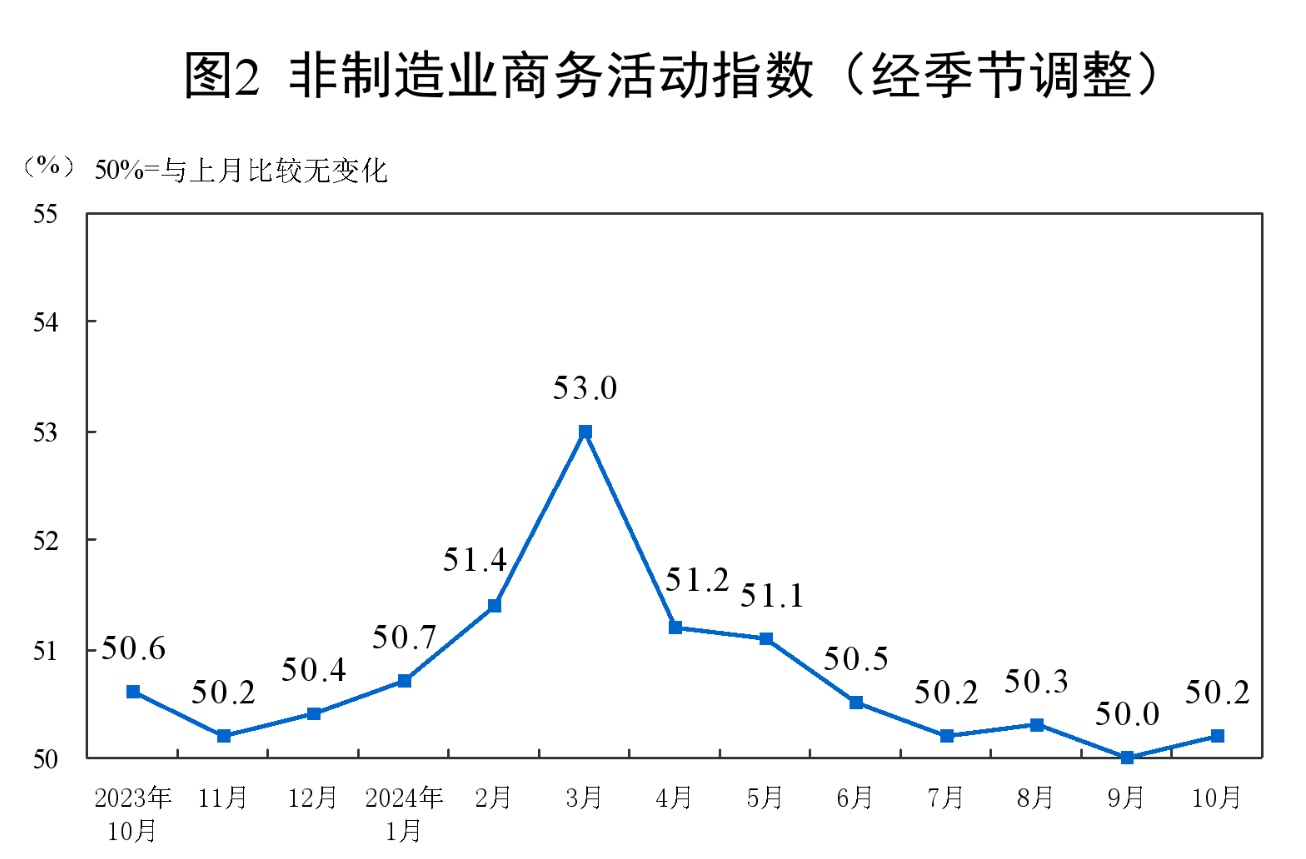 10月份,非制造业商务活动指数为50.2%,比上月上升0.2个百分点,非制造业景气水平小幅回升。