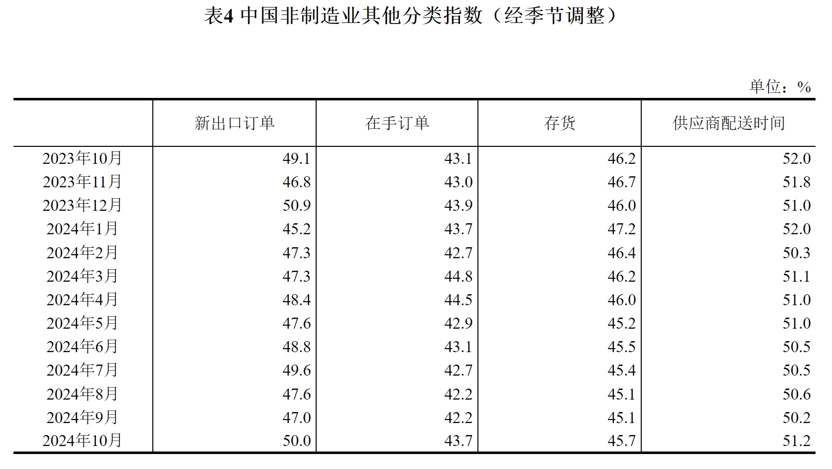 供应商配送时间指数为49.6%,比上月上升0.1个百分点,仍低于临界点,表明制造业原材料供应商交货时间较上月延长。