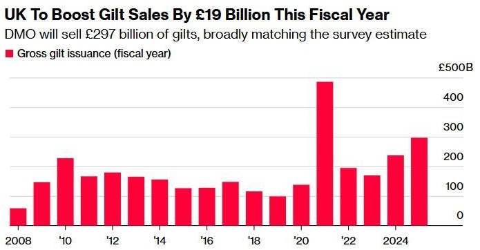 英国财政大臣雷切尔·里夫斯(Rachel Reeves)周三在其首份预算中宣布了30年来最大幅度的增税,理由是她必须通过大量支出来修复该国破碎的公共服务。英国债务管理办公室(DMO)周三表示,2024至2025财年将发行2970亿英镑的政府债券,超过了外媒对16家债券交易商调查所得出的2930亿英镑的预估值。