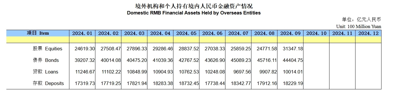 智通财经APP获悉,10月31日,中国人民银行数据显示,9月末境外机构持有股票为3.13万亿元人民币,较8月末的2.48万亿元人民币有所增加。分项目看,9月末境外机构持有的金融产品中,股票、贷款和存款均录得上升,唯有债券相比8月末有所减少,录得4.44万亿人民币。