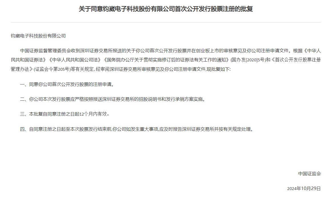 智通财经APP获悉,10月31日,中国证监会发布《关于同意钧崴电子科技股份有限公司首次公开发行股票注册的批复》。据悉,钧崴电子拟在深交所创业板上市,IPO保荐机构为华泰联合证券,拟募资11.2745亿元。