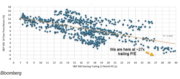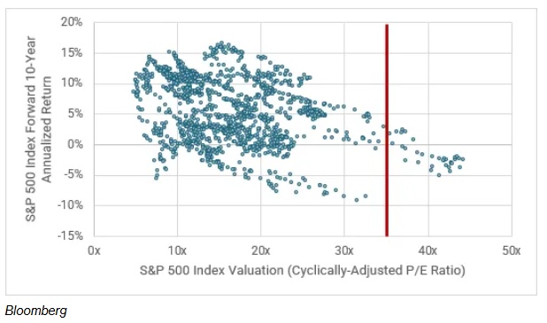 Catalyst Funds联合创始人兼首席信息官大卫•米勒表示:这是根据现有的经周期调整的市盈率计算标准普尔500指数未来10年的回报率。我们现在的市值是现在的36倍。回顾1900年以来的历史数据,标准普尔500指数未来10年的回报率为负84%,CAPE为36倍。估值也依然偏高。