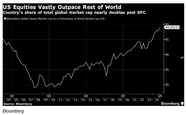 Unlimited联合创始人兼首席执行官鲍勃•埃利奥特表示:尽管短期来看,由于美联储相对于强劲的潜在增长奉行“过于宽松”的政策,美国有继续走强的势头,但目前的定价表明,未来盈利和财富可能永远难以令人置信地集中到美国企业。上一次美国股市出现这样的市值份额是在科技股泡沫破裂之前,我们都知道接下来几年的情况。
