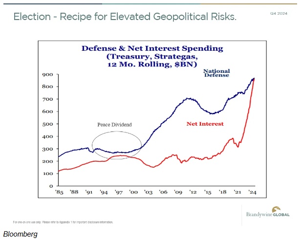 Brandywine Global Investment Management投资组合经理杰克·麦金太尔表示:美国政府支付的利息支出超过了国防支出。这两大支出短期内都不会走下坡路。它只是突显出我们的支出远远超出了我们的能力,靠债务生活,在某个时候,债券义务警员将会复仇。也许最快下个星期。