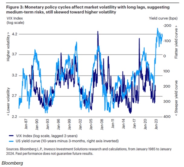 Invesco Solutions投资主管阿莱西奥•德•隆吉斯表示:虽然市场已经庆祝了紧缩周期的结束,并消化了2024年及以后的多次降息,但我们不应忽视这样一个事实,即上一轮紧缩周期在规模和速度上都是历史上最激进的紧缩周期之一,而且其滞后效应仍在影响经济和金融体系。虽然每个周期都不同,但多个周期的历史证据提醒我们,市场和经济可能需要长达两年的时间才能完全消化货币政策的影响。因此,未来几个季度经济增长放缓也就不足为奇了。这种情况并不一定意味着经济衰退,但仍预示着经济增长面临下行风险,以及股市波动加剧的风险。