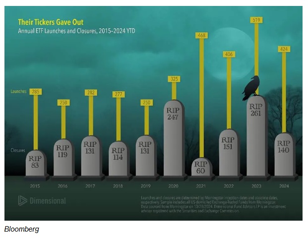 Dimensional Fund Advisors高级投资总监韦斯•克里尔表示:这是一个可怕的想法:你的万圣节糖果储备可能比许多现有的ETF更持久。事实上,在2024年前三个季度,已有140只ETF关闭。这延续了ETF行业长期以来的一个趋势,即几乎在它们推出时就迅速关闭。ETF领域的增长为投资者的投资组合提供了越来越多的选择。但这些流失数据提醒投资者,他们需要评估这些策略的背后是什么,并选择符合其长期目标的资产类别。这可能有助于避免追逐当月投资的板块,这一点尤为重要。