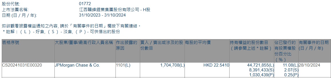 智通财经APP获悉,香港联交所最新资料显示,10月28日,小摩增持赣锋锂业(01772)170.4708万股,每股作价22.541港元,总金额约为3842.58万港元。增持后最新持股数目约为4472.19万股,最新持股比例为11.08%。