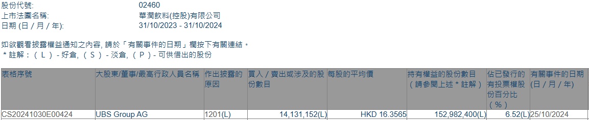 智通财经APP获悉,香港联交所最新资料显示,10月25日,瑞银减持华润饮料(02460)1413.1152万股,每股作价16.3565港元,总金额约为2.31亿港元。减持后最新持股数目约为1.53亿股,最新持股比例为6.52%。