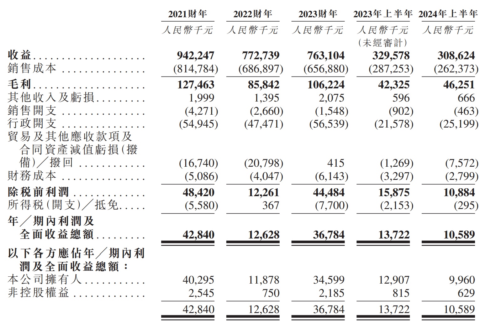 财务方面,于2021财年、2022年财年、2023财年、2024上半年,粤源建设实现收益分别约为9.42亿元、7.73亿元、7.63亿元、3.09亿元人民币;同期,利润分别约为4284万元、1262.8万元、3678.4万元、1058.9万元人民币。