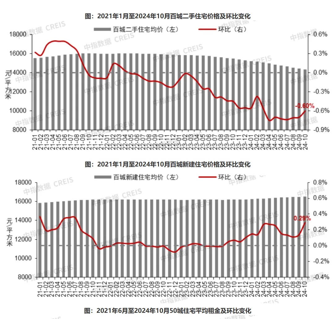 智通财经APP获悉,中指研究院发文称,根据中国房地产指数系统百城价格指数对全国100个城市新建、二手住宅销售市场及50个城市租赁市场的调查数据,2024年10月,百城二手住宅平均价格为14360元/平方米,环比下跌0.60%,跌幅较9月收窄0.10个百分点;同比下跌7.27%。10月,核心城市二手房成交放量,业主议价空间缩小,百城二手住宅价格环比跌幅收窄。百城新建住宅平均价格为16532元/平方米,环比上涨0.29%,同比上涨2.08%。