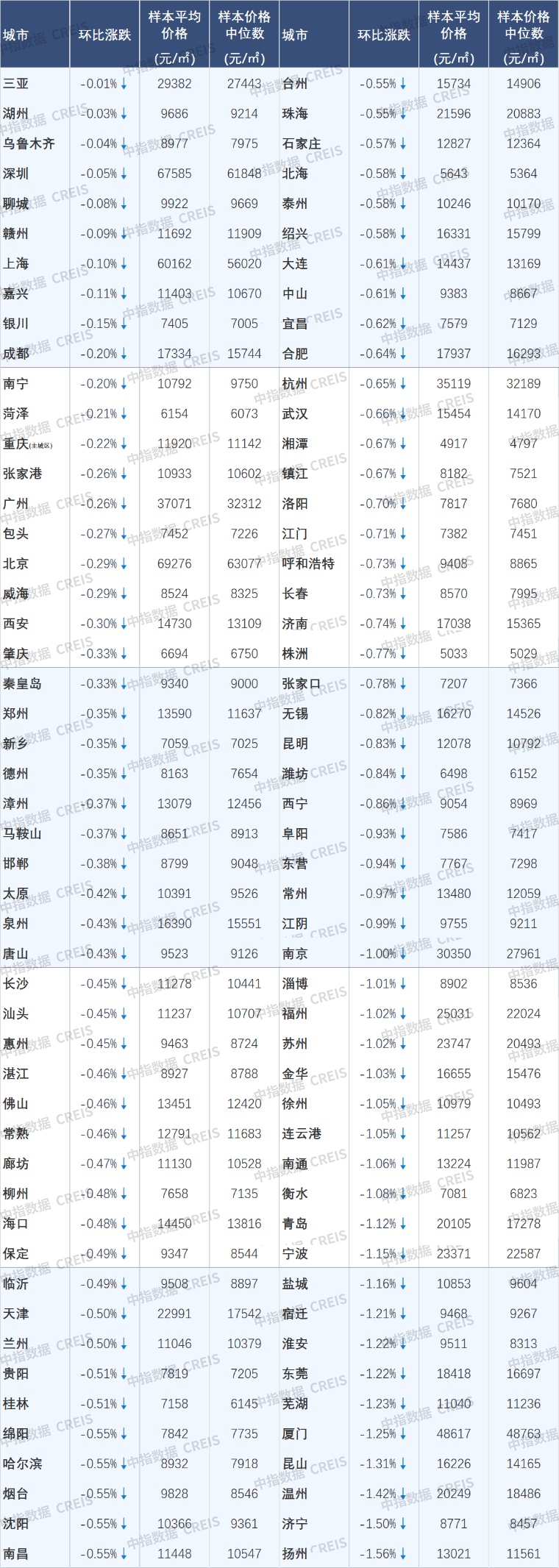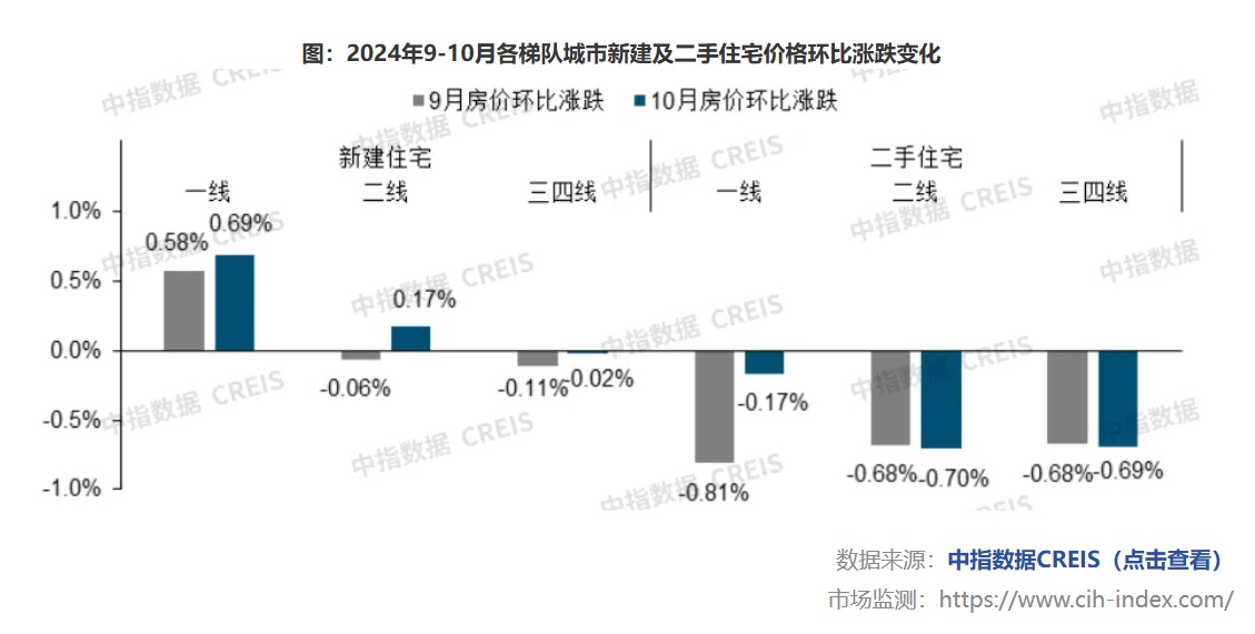 根据中国房地产指数系统百城价格指数,二手住宅方面,10月一线城市二手住宅价格环比下跌0.17%,较9月大幅收窄0.64个百分点。其中深圳房价环比下跌0.05%,跌幅收窄最为显著。深圳929新政后,二手住宅成交量迅速回升,创下自2021年4月以来的月度新高。随着成交量的显著回升,深圳二手住宅价格止跌态势初现。北京10月二手住宅成交突破1.6万套,创下自去年4月以来新高,二手住宅价格环比跌幅亦大幅收窄至0.29%。二线城市二手住宅价格环比下跌0.70%,梯队内各城市价格走势表现分化,成都、重庆、西安等城市房价跌幅收窄,青岛、苏州、南京环比跌幅仍较大。三四线代表城市二手住宅价格环比下跌0.69%。