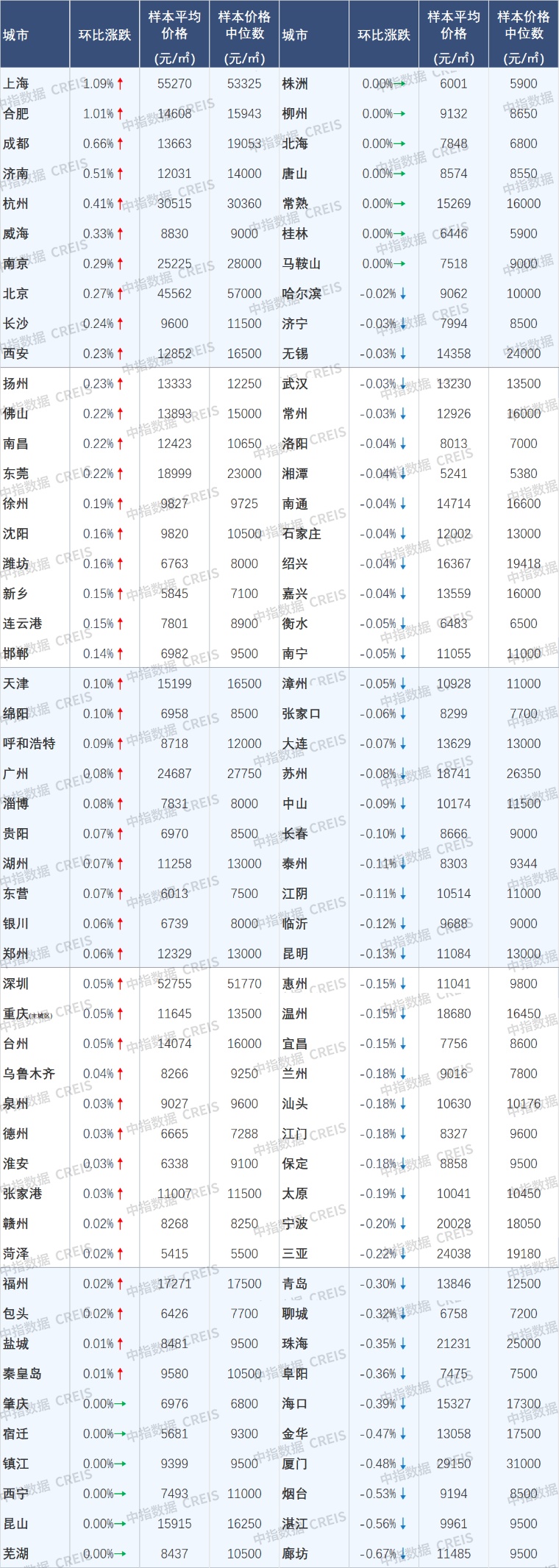 新建住宅方面,10月一线及二线城市新房价格环比分别上涨0.69%、0.17%,房企加快推盘节奏,部分优质改善项目入市带动城市新房价格结构性上涨。其中上海、合肥新房价格环比涨幅居百城前列,主要受圣和静安公馆(上海)、青溪雲邸(上海)、古北99(上海)、保利龙川瑧悦(合肥)等高价新开盘项目结构性影响。三四线代表城市房价环比下跌0.02%。