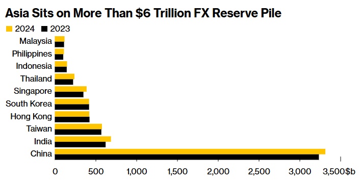 根据10个经济体的数据,亚洲(不包括日本)的6.4万亿美元储备与此前相比有所增长,2023年底为6.2万亿美元、前一年为5.9万亿美元。中国的外汇储备几乎占全球外汇储备的一半,而印度的外汇储备已膨胀至创纪录的7000亿美元。