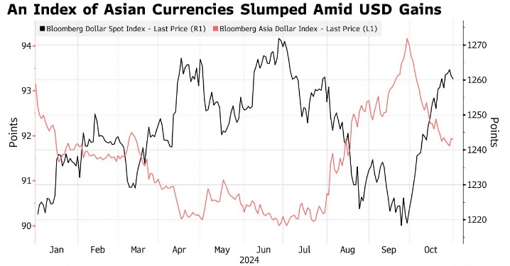 智通财经获悉,亚洲当前的外汇储备高达6.4万亿美元,这让投资者相信各大央行有足够的弹药来应对美国总统大选引发的美元走强。亚洲货币在10月份面临压力,特朗普当选美国总统的可能性上升以及围绕美联储宽松步伐的不确定性提振了美元。彭博亚洲货币指数刚刚经历了自2023年2月以来最糟糕的一个月,印度卢比接近历史最低点,韩元接近三个月低点。