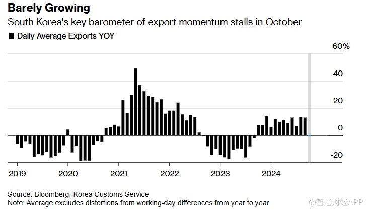 韩国贸易部表示,10月份韩国对美出口同比增长3%,对中国的出口增长了11%。