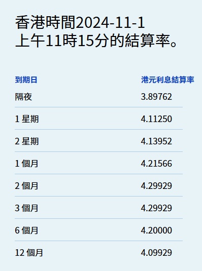 智通财经APP获悉,11月1日,港元拆息在月结过后普遍回软,其中,隔夜息大幅回落80基点至3.89762%,而与楼按相关的一个月拆息亦结束三连升,报4.21566%。