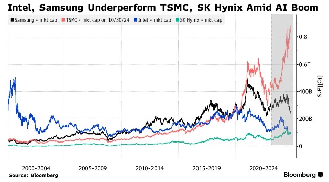 这家曾经随处可见“Intel Inside”标签的美国公司,因耗资巨大而启动代工业务而受到冲击,同时还面临着英伟达(NVDA.US)等新兴 AI 芯片设计公司的冲击。韩国电视和智能手机巨头三星正在为自己的代工梦想而苦苦挣扎,并且在 AI 内存领域落后于一个规模较小的竞争对手。
