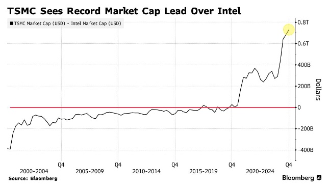 人工智能颠覆了全球芯片估值格局。三星目前的市值不到英伟达芯片的主要外包制造商台积电的三分之一。就在四年前,他们还是旗鼓相当的。英特尔曾经是世界上最大的芯片制造商,与台积电的差距已攀升至创纪录的7亿美元以上。