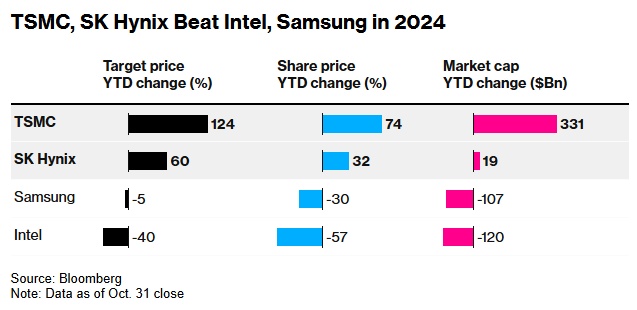 据彭博社汇编的数据,今年分析师对台积电的目标股价已上涨一倍多,对 SK 海力士的目标股价上涨 60%。而对英特尔的目标股价已下调 40%,对三星的目标股价已下调 5% 左右。