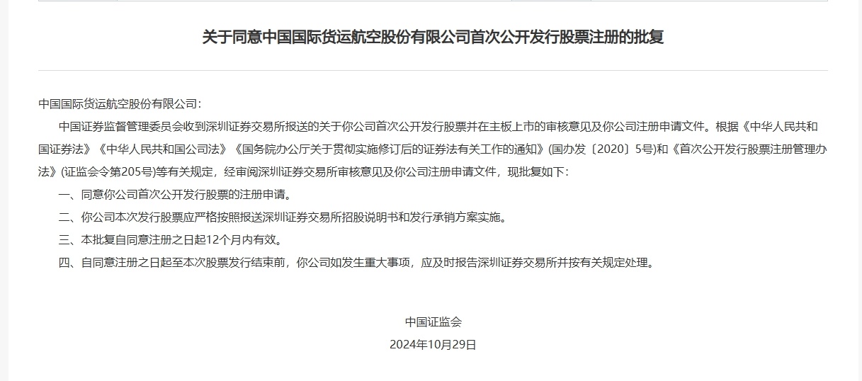 智通财经APP获悉,11月1日,中国证监会发布《关于同意中国国际货运航空股份有限公司首次公开发行股票注册的批复》。据悉,国货航拟在深交所主板上市,IPO保荐机构为中信证券股份有限公司,拟募资35亿元。