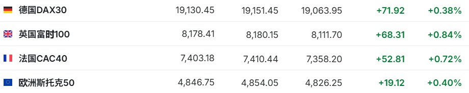 2. 截至发稿,德国DAX指数涨0.38%,英国富时100指数涨0.84%,法国CAC40指数涨0.72%,欧洲斯托克50指数涨0.40%。