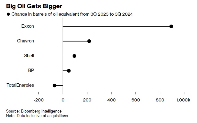 美国石油巨头的产量增长得益于二叠纪盆地创纪录的原油产量,该盆地的同比增长和效率提升继续令分析师感到意外。在以600亿美元收购先锋自然资源的推动下,埃克森美孚的石油和天然气产量同比增长24%,而雪佛龙的产量增长了7%。