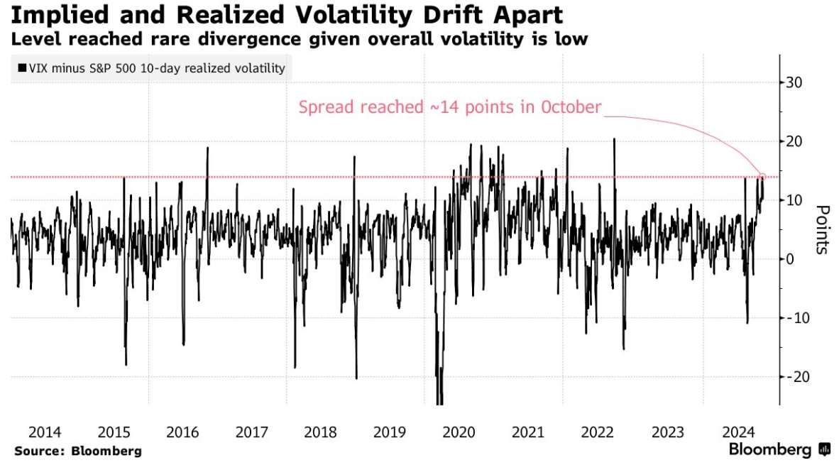 尽管市场波动不大,但 10 月份大部分时间股票期权波动率都在上升,因为市场不仅在期待即将到来的选举,还在期待财报季和美联储利率决定。在投票前的最后几天,卡玛拉·哈里斯和唐纳德·特朗普之间的竞争难以预料。