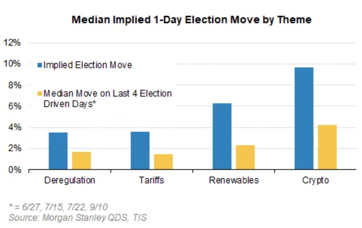 正如预期的那样,大部分针对选举的对冲都是在最后一刻出现的,因为短期期权使得在事件发生前进行套期保值变得更加容易。隐含波动率远高于实际水平,尽管标准普尔 500 指数已连续 29 个交易日跌幅不超过 1%,但投资者仍准备迎接更大幅度的波动。