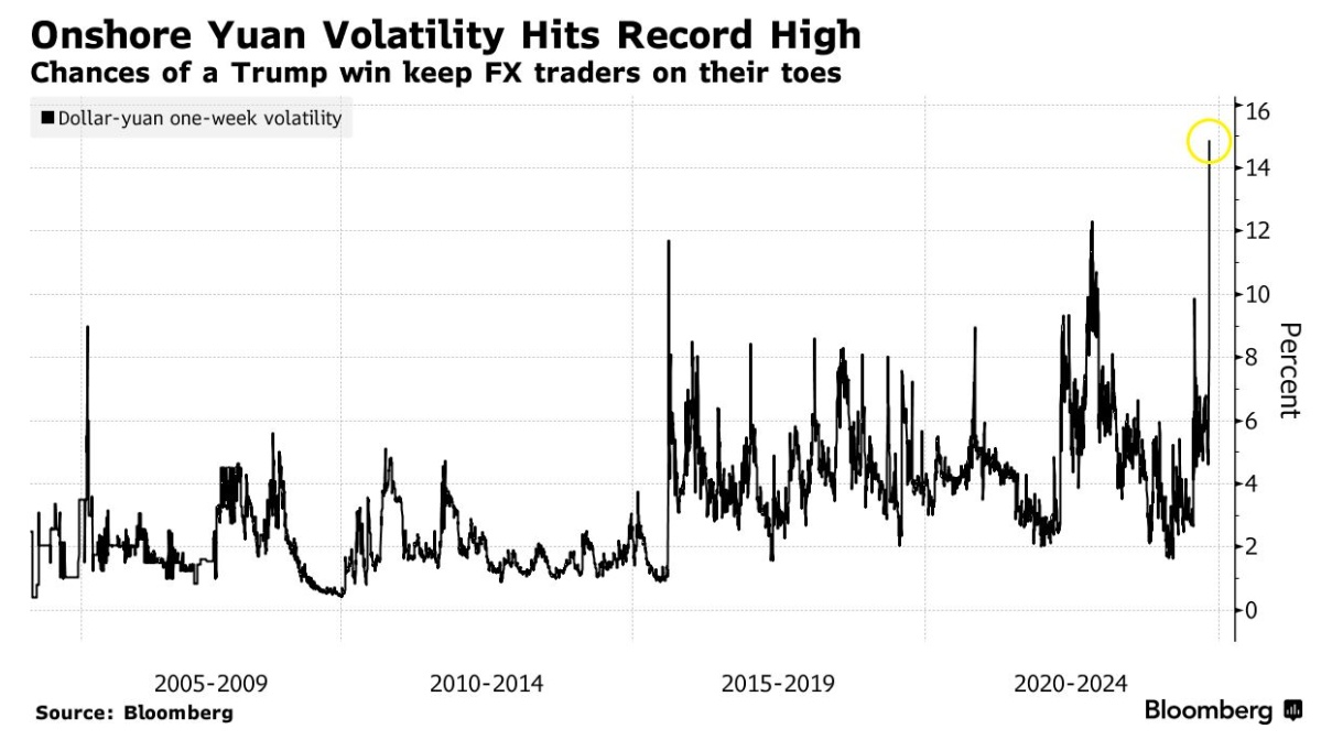 短期外汇期权目前已将大选风险纳入定价,隐含波动率出现大幅上涨,因预期美国大选后波动幅度将扩大。上周晚些时候,美元兑人民币一周波动率创下历史新高,因交易员对冲特朗普威胁的美国提高关税的可能性,以及可能对中国造成特别严重伤害的全球贸易战。