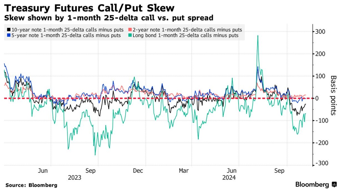 彭博情报首席全球衍生品策略师Tanvir Sandhu表示:“选举波动溢价在债券市场的长期利率上最为明显,我们认为这反映了人们对大选结果可能带来的更高财政风险的担忧。”“这种倾斜表明,对使用付款人互换期权对冲长期利率下跌的需求。”