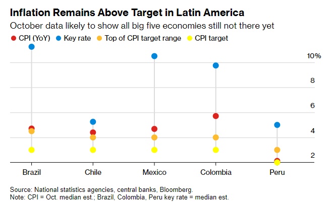 由于秘鲁已经公布了10月上升的通胀数据,在该地区五大通胀目标央行中,很可能只有哥伦比亚央行的通胀水平有所回落,而且没有一家央行的通胀水平达到或低于其目标。