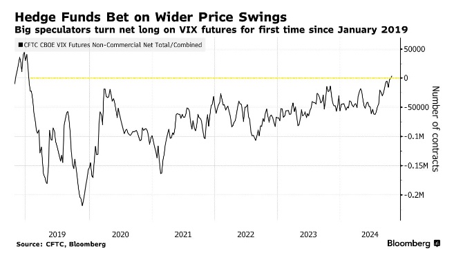 也许不足为奇的是,市场看起来很紧张。标普500指数接近历史最高点,而VIX指数超过20。标普上一次在这个被称为“恐慌指数”达到如此高的水平下创下新高还是在2021年3月新冠疫情爆发期间。与此同时,对冲基金押注于更大范围的价格波动。美国商品期货交易委员会(CFTC)本月早些时候公布的数据显示,自2019年1月以来,大型投机者首次净做多VIX指数期货。