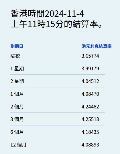智通财经APP获悉,11月4日,市场观望本周美国总统选举及美联储议息两大重磅事件,港元拆息全线下跌,其中,隔夜息跌24基点至3.65774%,为9月20日以来最低,一周拆息跌穿4%,低见3.99179%,而与楼按相关的一个月拆息亦连跌两天,报4.0847%,见五周低位。