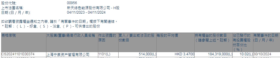 智通财经APP获悉,香港联交所最新资料显示,10月30日,上海宁泉资产管理有限公司增持新天绿色能源(00956)51.4万股,每股作价3.47港元,总金额为178.358万港元。增持后最新持股数目约为1.843亿股,最新持股比例为10.02%。