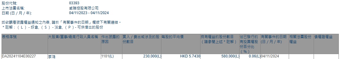 智通财经APP获悉,香港联交所最新资料显示,11月4日,李鸿增持威胜控股(03393)23万股,每股作价5.7430港元,总金额约为132.09万港元。增持后最新持股数目约为58万股,最新持股比例为0.06%。