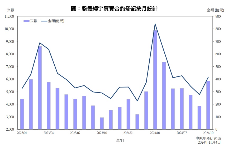 10月份整体住宅楼宇买卖登记录4,697宗及372.75亿港元,较9月的2,848宗及208.38亿港元,分别上升64.9%及78.9%,宗数及金额齐创今年5月后近5个月新高。首10个月住宅楼宇录42,698宗及3,645.32亿港元,已达2023年全年43,002宗及3,892.47亿港元的99.3%及93.7%。