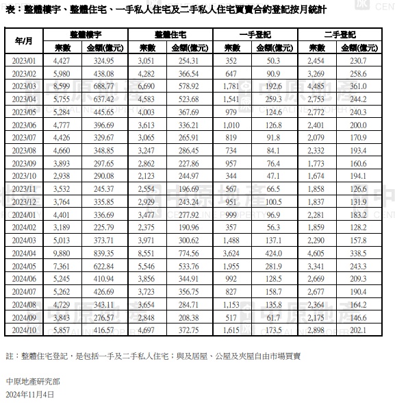 一手私人住宅方面,10月份一手录1,615宗及173.5亿港元,较9月的517宗及61.7亿港元,分别急升2.12倍及1.81倍,宗数及金额同创今年5月后近5个月新高。踏入减息周期,发展商积极推售新盘及货尾,带动一手交投显著反弹。近期多个新盘热销,11月一手登记有望升破二千宗水平。另外,首10个月一手录13,527宗及1,654.4亿港元,已较2023年全年10,682宗及1,310.7亿港元,高出26.6%及26.2%。预测全年一手约16,500宗,将为2021年17,469宗后的3年新高。