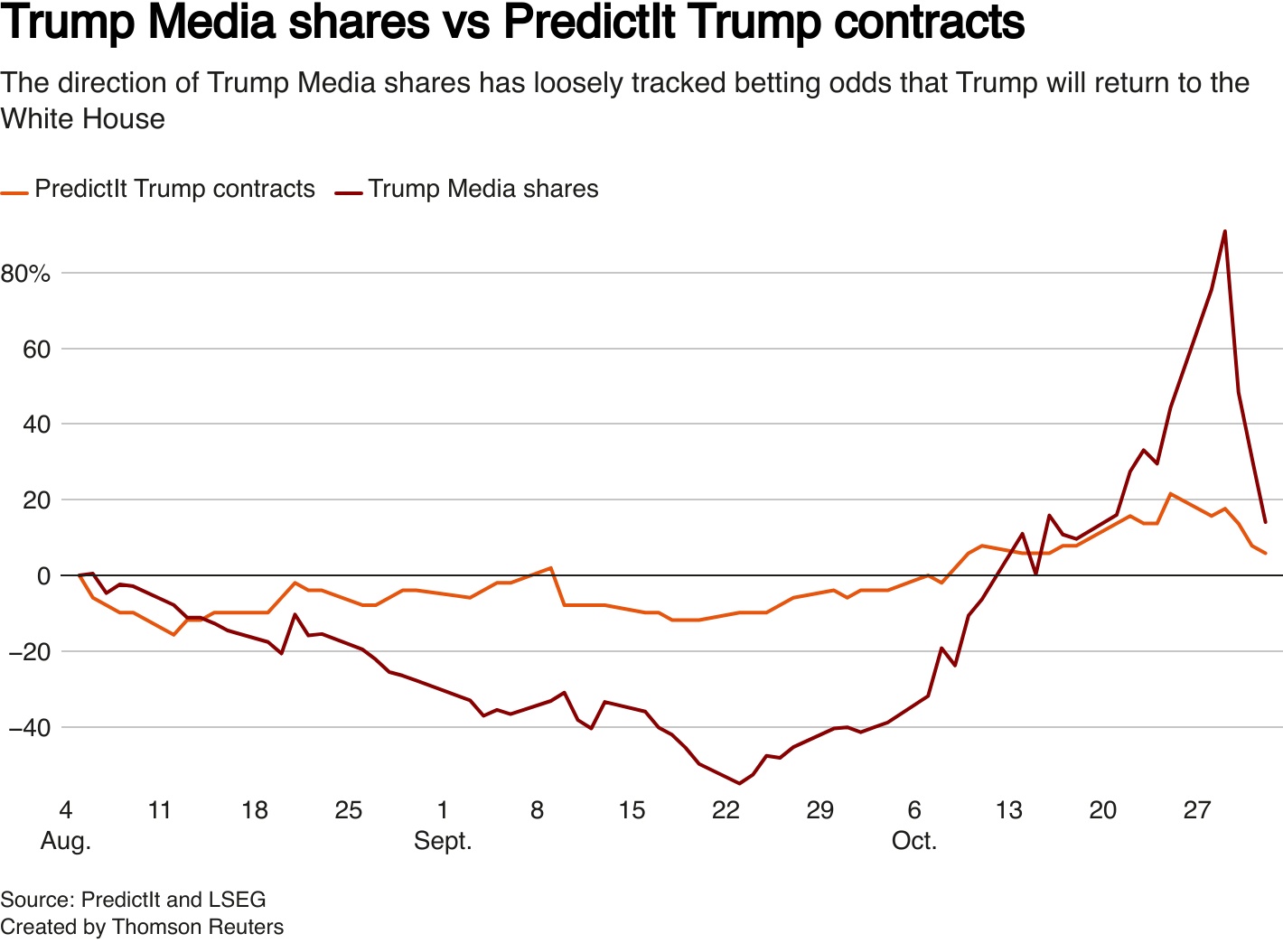 交易员预计,未来几天特朗普媒体科技集团的股价将出现大幅波动。期权定价显示,到11月8日,特朗普媒体科技集团的股价将出现50%左右的上下波动。