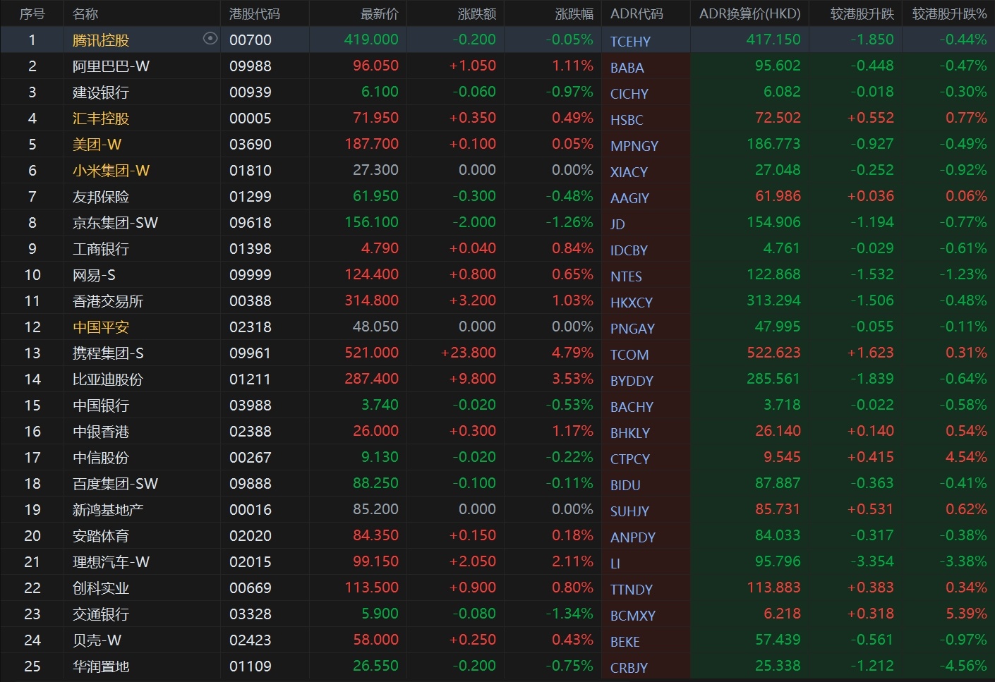 大型蓝筹股涨跌互现,汇丰控股收报72.502港元,较香港收市涨0.77%;腾讯控股收报417.150港元,较香港收市跌0.44%。