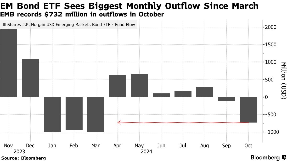 智通财经APP获悉,随着美国大选结果的不确定性增加,投资者在10月份纷纷撤资新兴市场债券ETF,显示出市场对风险的谨慎态度。据数据显示,iShares JP Morgan美元新兴市场债券ETF(EMB.US)在10月份出现了7.32亿美元的资金流出,这是自3月份以来的最大单月跌幅。同时,Invesco新兴市场主权债务ETF(PCY.US)也有7800万美元的资金流出。