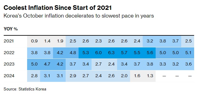 根据周二的数据,韩国10月剔除能源和食品外的价格较上年同期上涨1.8%,较9月的2%有所放缓,这是通胀压力得到控制的另一个迹象。