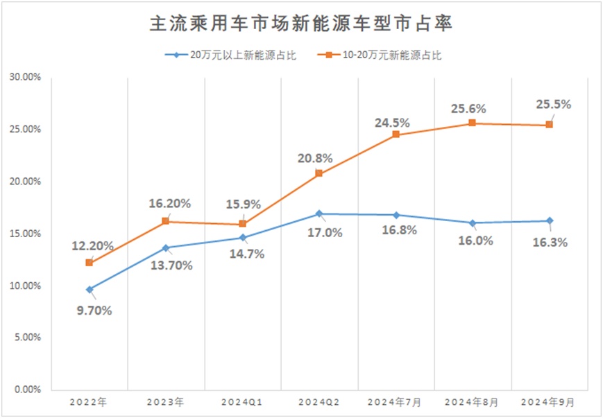 中国乘用车联合会数据显示,今年以来10-20万元新能源乘用车渗透速度进入快车道。Q1渗透率为15.9%,与20万及以上新能源乘用车渗透率相持平。Q2则上升至20.8%,高于市场平均水平。至7、8、9月份则持续攀升至25%左右,进入早期大众化阶段。