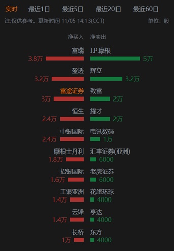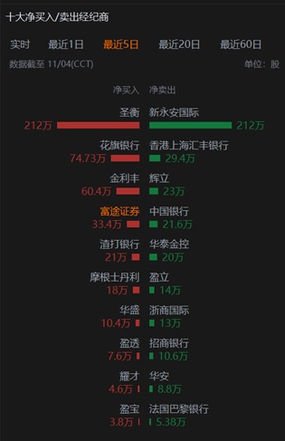 截至11月5日14点,J.P摩根、辉立为卖出方“大头”,分别卖出5万股、3.2万股,其次是致富与耀才均卖出2万股,其中辉立持股量已从此前的0.27%下降至4日的0.24%;在买入方,富瑞以3.8万股的净买入量排名第一,盈透则买入3.2万股,富途买入3万股,紧随其后的为恒生与中银国际。不过,截至4日,盈透持股量仅为0.05%,恒生持股量仅为0.1%。