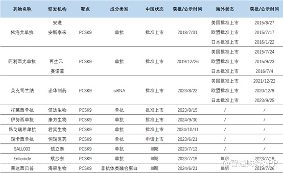 截至目前,全球共获批了6款PCSK9抑制剂,一款药物正申请上市,处于临床阶段的管线共36条,III期4条,II期9条,I期23条。其中,获批的6款PCSK9抑制剂中包括5款单抗和1款siRNA药物。